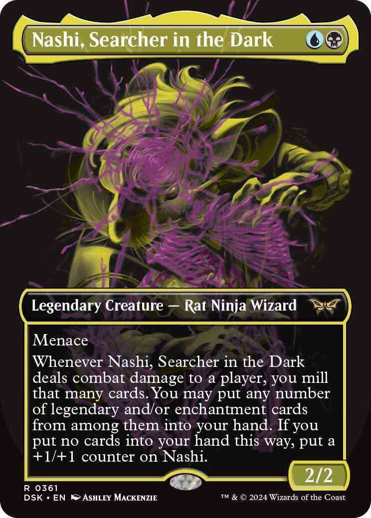 Menace Whenever Nashi, Searcher in the Dark deals combat damage to a player, you mill that many cards. You may put any number of legendary and/or enchantment cards from among them into your hand. If you put no cards into your hand this way, put a +1/+1 counter on Nashi.