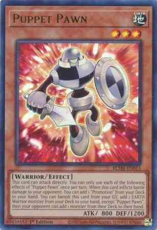 This card can attack directly. You can only use each of the following effects of "Puppet Pawn" once per turn. When this card inflicts battle damage to your opponent: You can add 1 "Promotion" from your Deck to your hand. You can banish this card from your GY; add 1 EARTH Warrior monster from your Deck to your hand, except "Puppet Pawn", then your opponent can add 1 monster from their Deck to their hand.