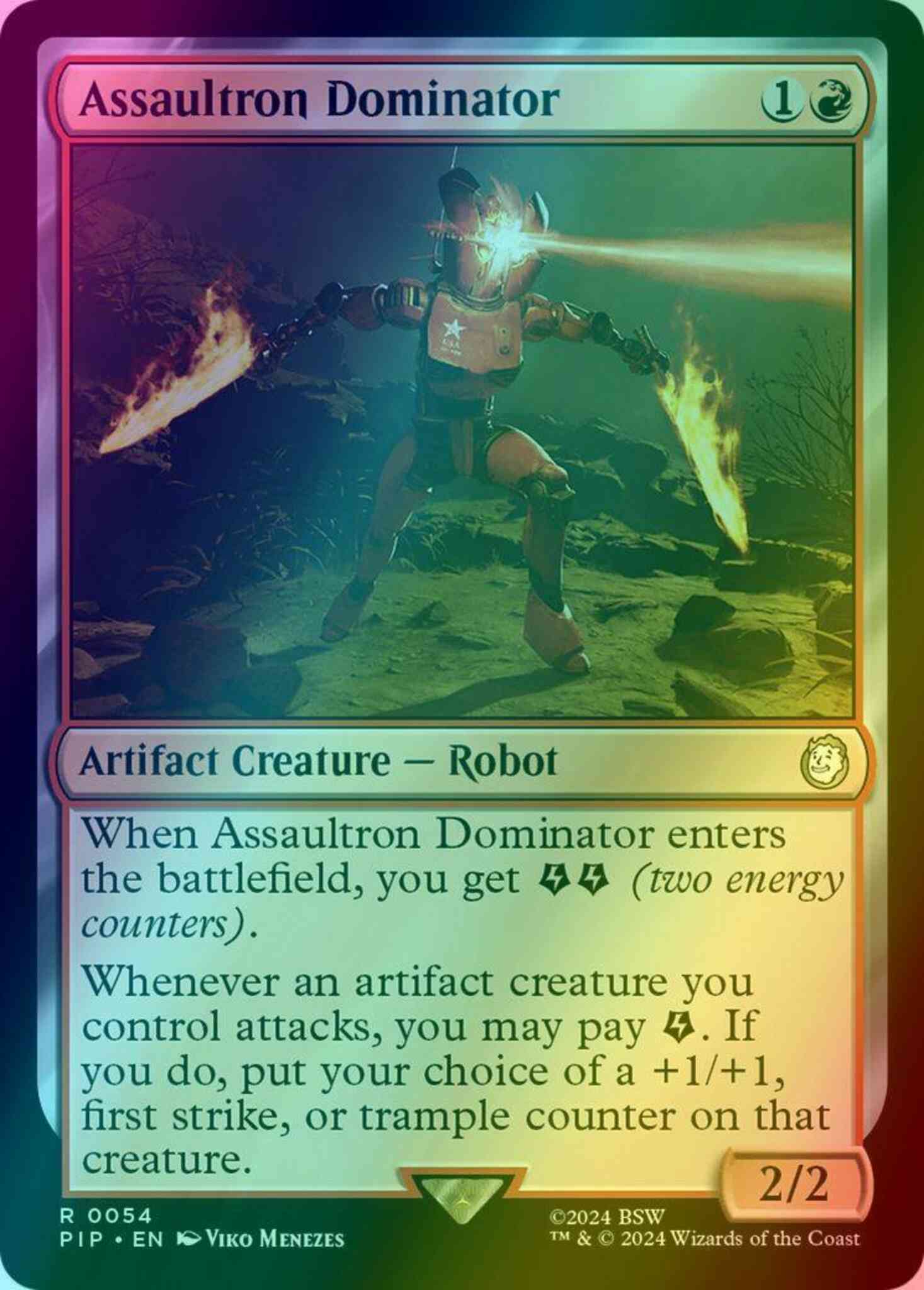 When Assaultron Dominator enters the battlefield, you get {E}{E} (two energy counters). Whenever an artifact creature you control attacks, you may pay {E}. If you do, put your choice of a +1/+1, first strike, or trample counter on that creature.