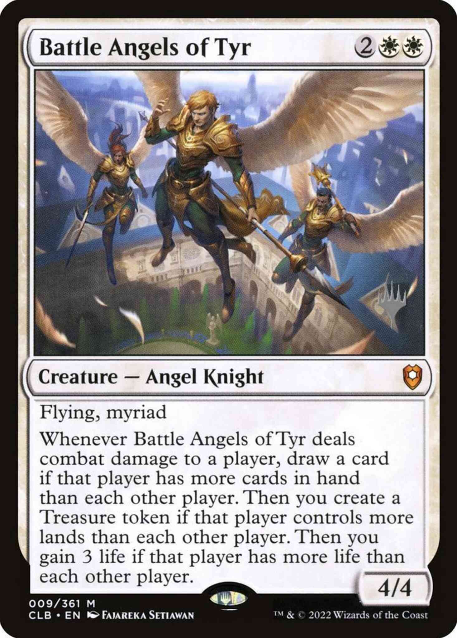Flying, myriad Whenever Battle Angels of Tyr deals combat damage to a player, draw a card if that player has more cards in hand than each other player. Then you create a Treasure token if that player controls more lands than each other player. Then you gain 3 life if that player has more life than each other player.