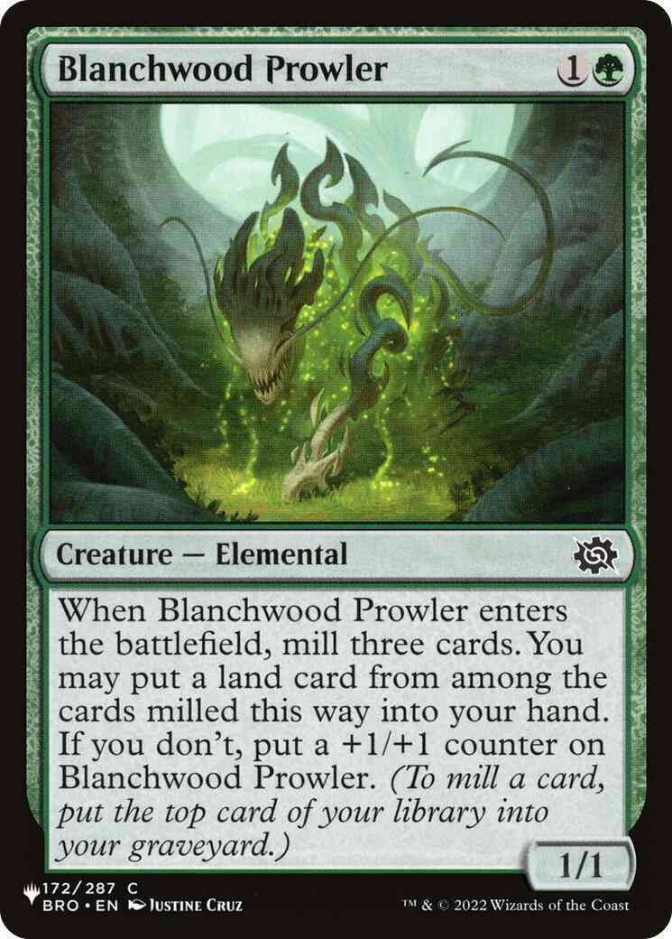 When Blanchwood Prowler enters, mill three cards. You may put a land card from among the cards milled this way into your hand. If you don't, put a +1/+1 counter on Blanchwood Prowler. (To mill a card, put the top card of your library into your graveyard.)