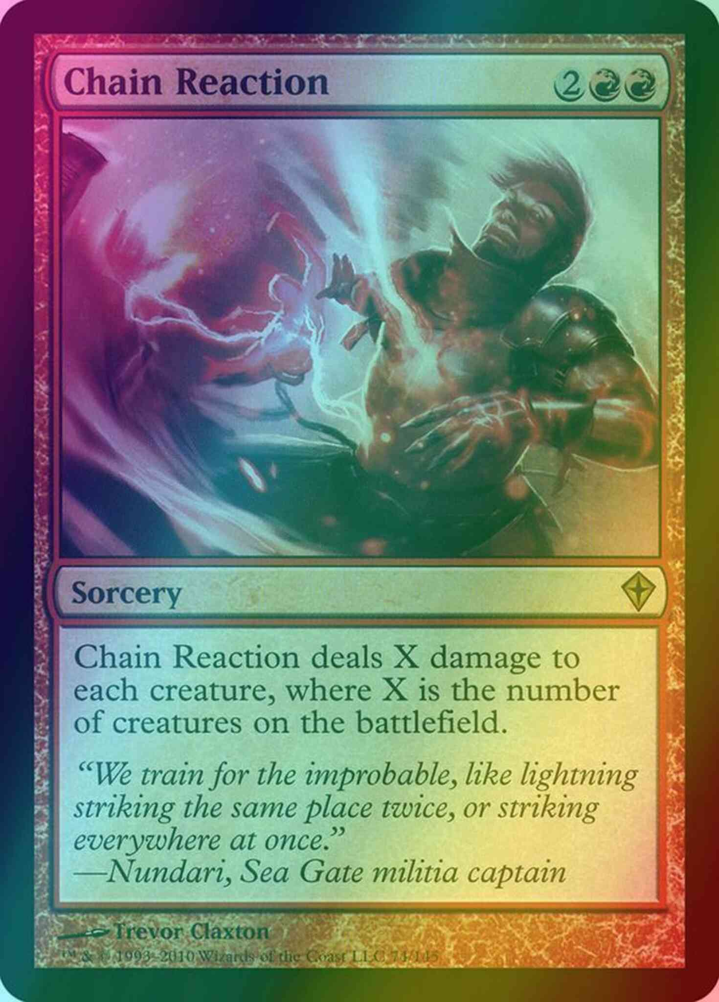 Chain Reaction deals X damage to each creature, where X is the number of creatures on the battlefield.