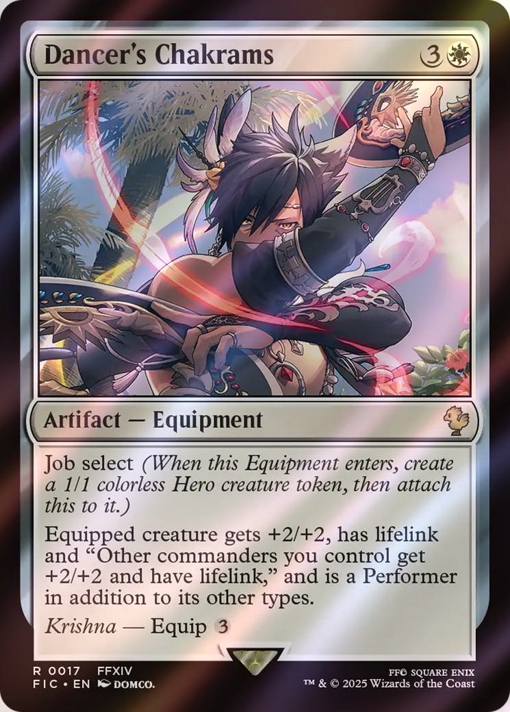 Job select (When this Equipment enters, create a 1/1 colorless Hero creature token, then attach this to it.) Equipped creature gets +2/+2, has lifelink and "Other commanders you control get +2/+2 and have lifelink," and is a Performer in addition to its other types. Krishna — Equip {3}