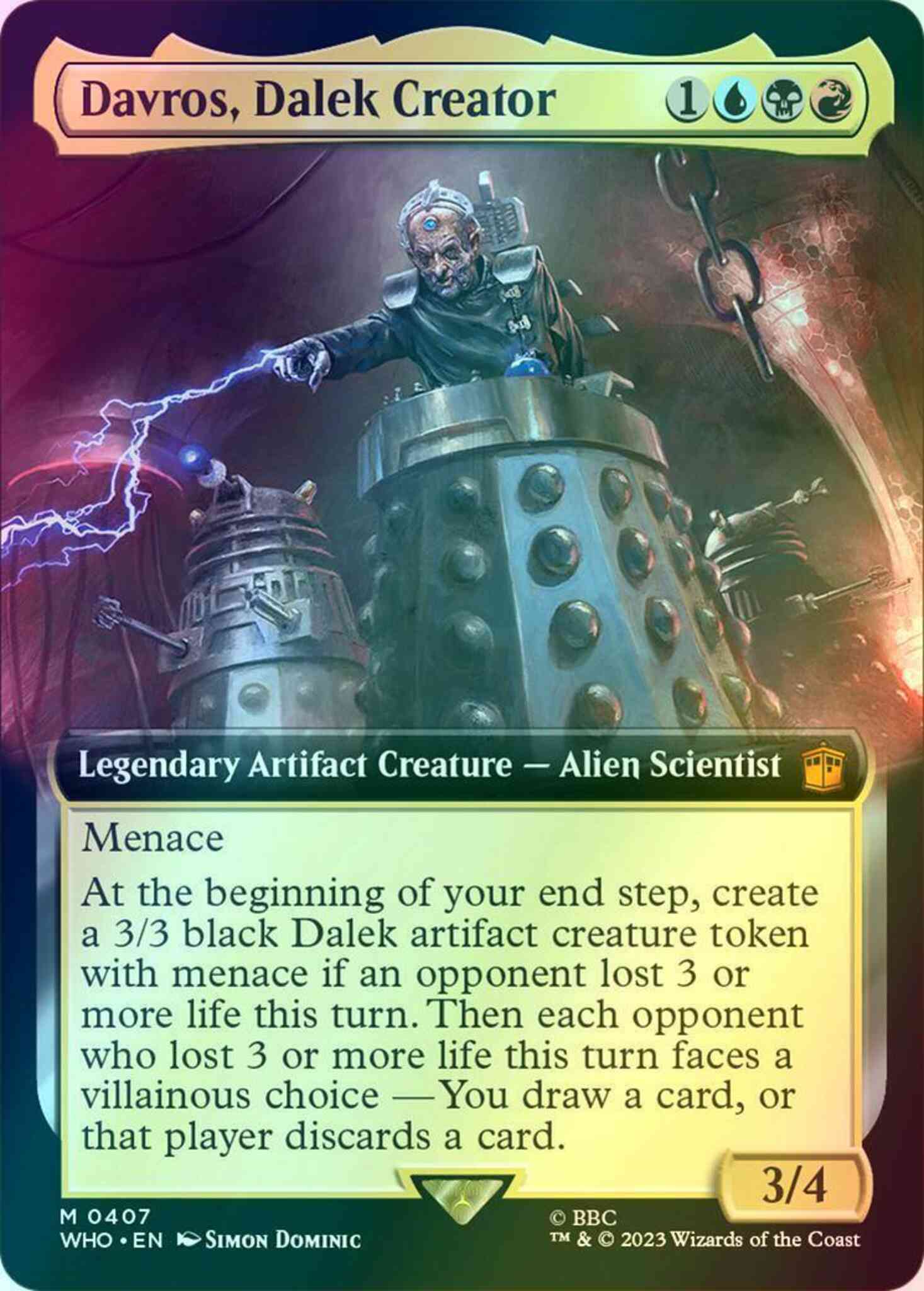 Card Text: Menace At the beginning of your end step, create a 3/3 black Dalek artifact creature token with menace if an opponent lost 3 or more life this turn. Then each opponent who lost 3 or more life this turn faces a villainous choice — You draw a card, or that player discards a card.