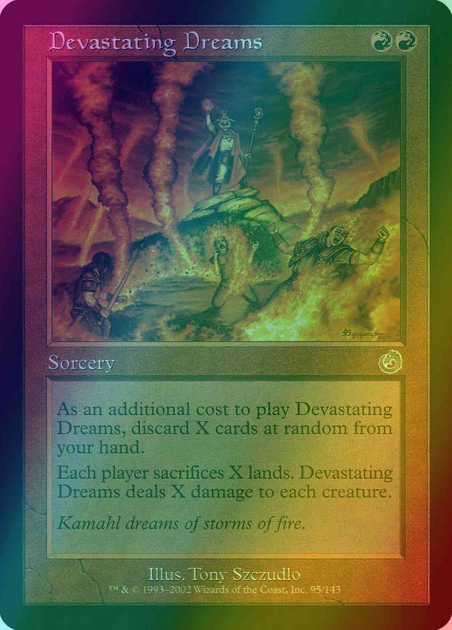 Each player sacrifices X lands. Devastating Dreams deals X damage to each creature.