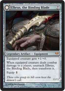 When equipped creature deals combat damage to a player, unattach Elbrus, the Binding Blade, then transform it.
