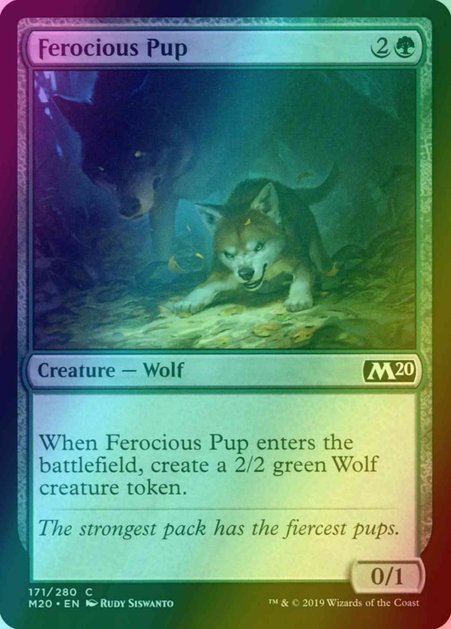 When Ferocious Pup enters the battlefield, create a 2/2 green Wolf creature token.