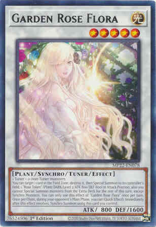 You can target 1 card in the Field Zone; destroy it, then Special Summon to its controller's field, 1 "Rose Token" (Plant/DARK/Level 2/ATK 800/DEF 800) in Attack Position, also you cannot Special Summon monsters from the Extra Deck for the rest of this turn, except Synchro Monsters. You can only use this effect of "Garden Rose Flora" once per turn. Once per Chain, during your opponent's Main Phase, you can (Quick Effect): Immediately after this effect resolves, Synchro Summon using this card you control.