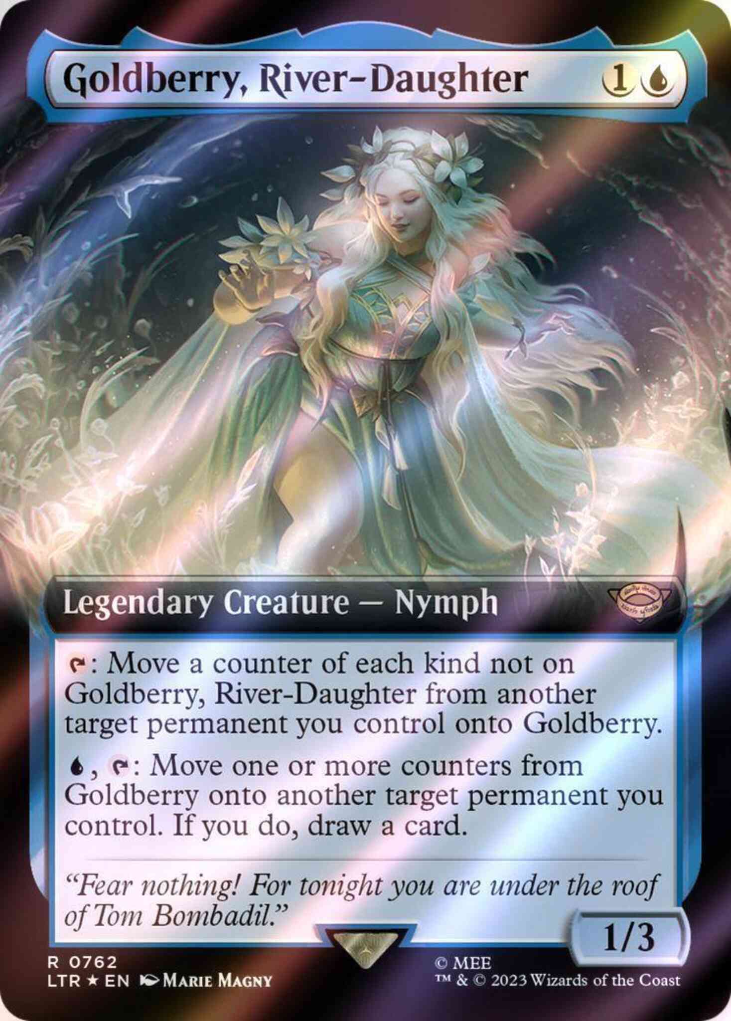 {T}: Move a counter of each kind not on Goldberry, River-Daughter from another target permanent you control onto Goldberry.