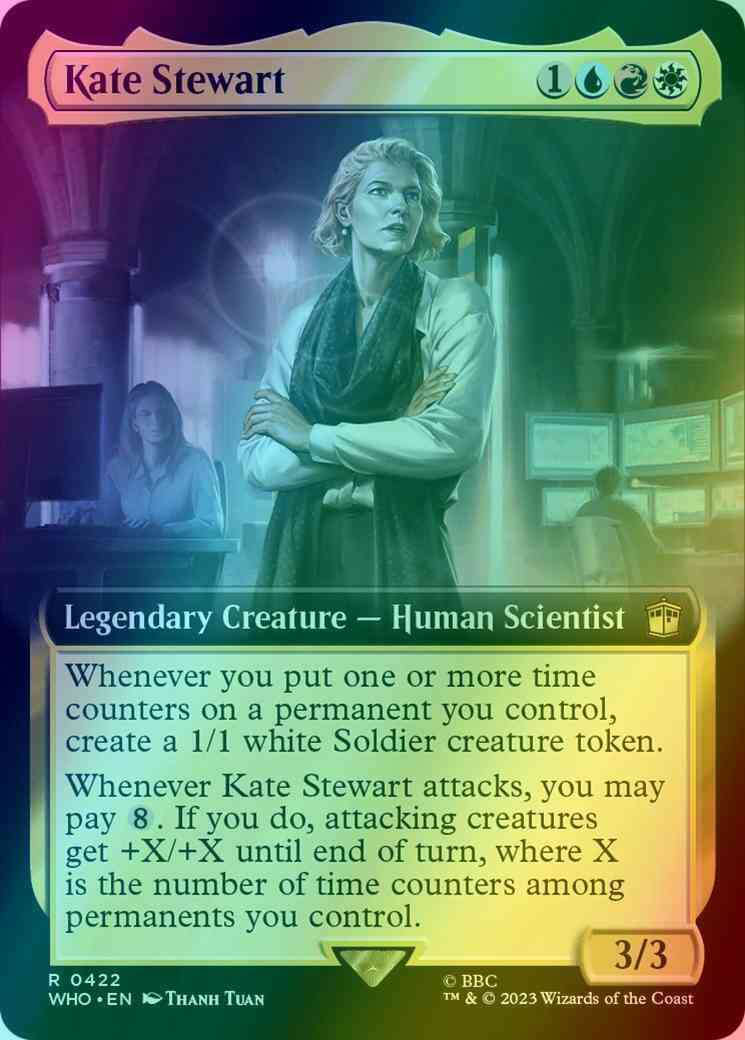 Whenever Kate Stewart attacks, you may pay {8}. If you do, attacking creatures get +X/+X until end of turn, where X is the number of time counters among permanents you control.
