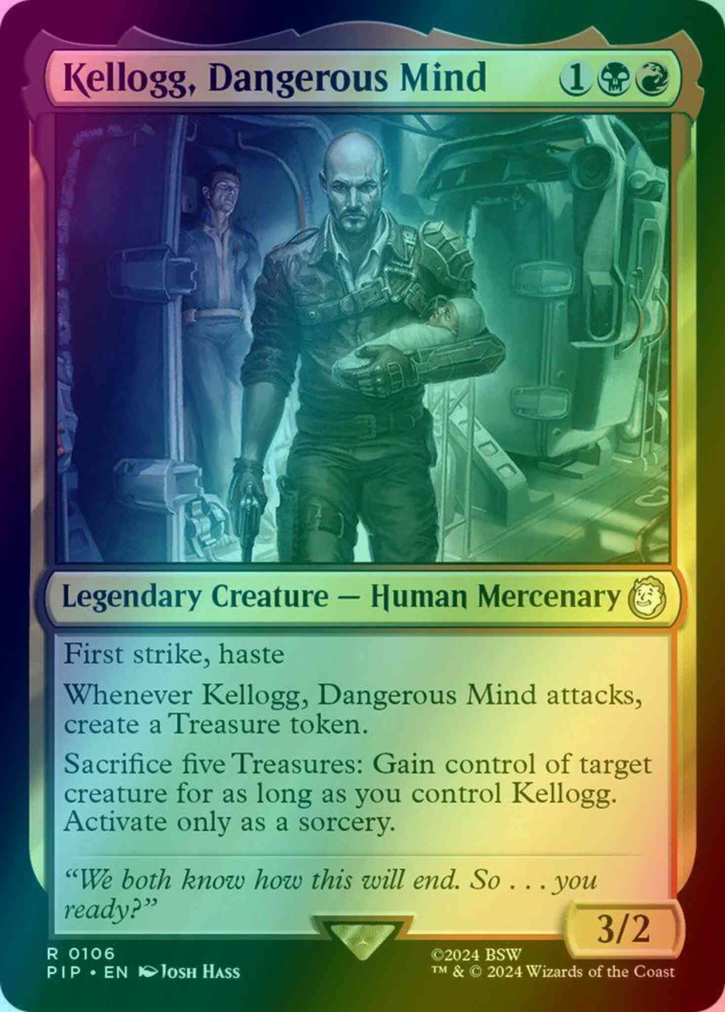 Card Text: First strike, haste Whenever Kellogg, Dangerous Mind attacks, create a Treasure token. Sacrifice five Treasures: Gain control of target creature for as long as you control Kellogg. Activate only as a sorcery.
