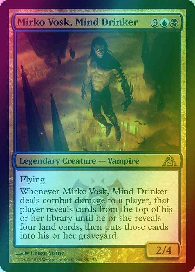 Card Text: Flying Whenever Mirko Vosk, Mind Drinker deals combat damage to a player, that player reveals cards from the top of their library until they reveal four land cards, then puts those cards into their graveyard.