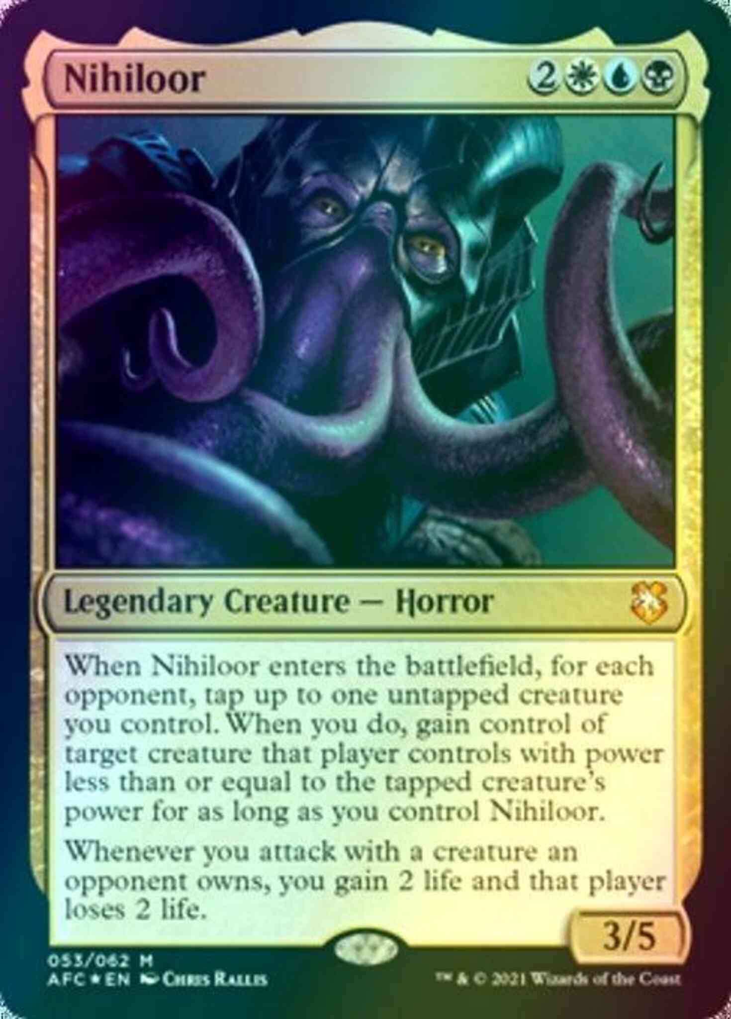 When Nihiloor enters the battlefield, for each opponent, tap up to one untapped creature you control. When you do, gain control of target creature that player controls with power less than or equal to the tapped creature's power for as long as you control Nihiloor.