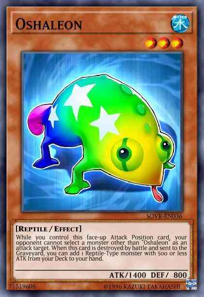 While you control this face-up Attack Position card, your opponent cannot select a monster other than "Oshaleon" as an attack target. When this card is destroyed by battle and sent to the Graveyard, you can add 1 Reptile-Type monster with 500 or less ATK from your Deck to your hand.
