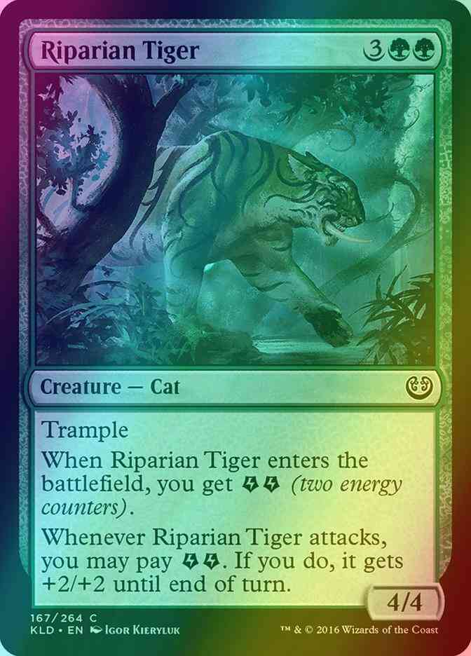 When Riparian Tiger enters the battlefield, you get {E}{E} (two energy counters).