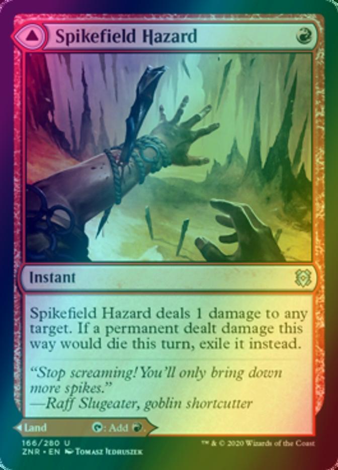 Spikefield Hazard deals 1 damage to any target. If a permanent dealt damage this way would die this turn, exile it instead.