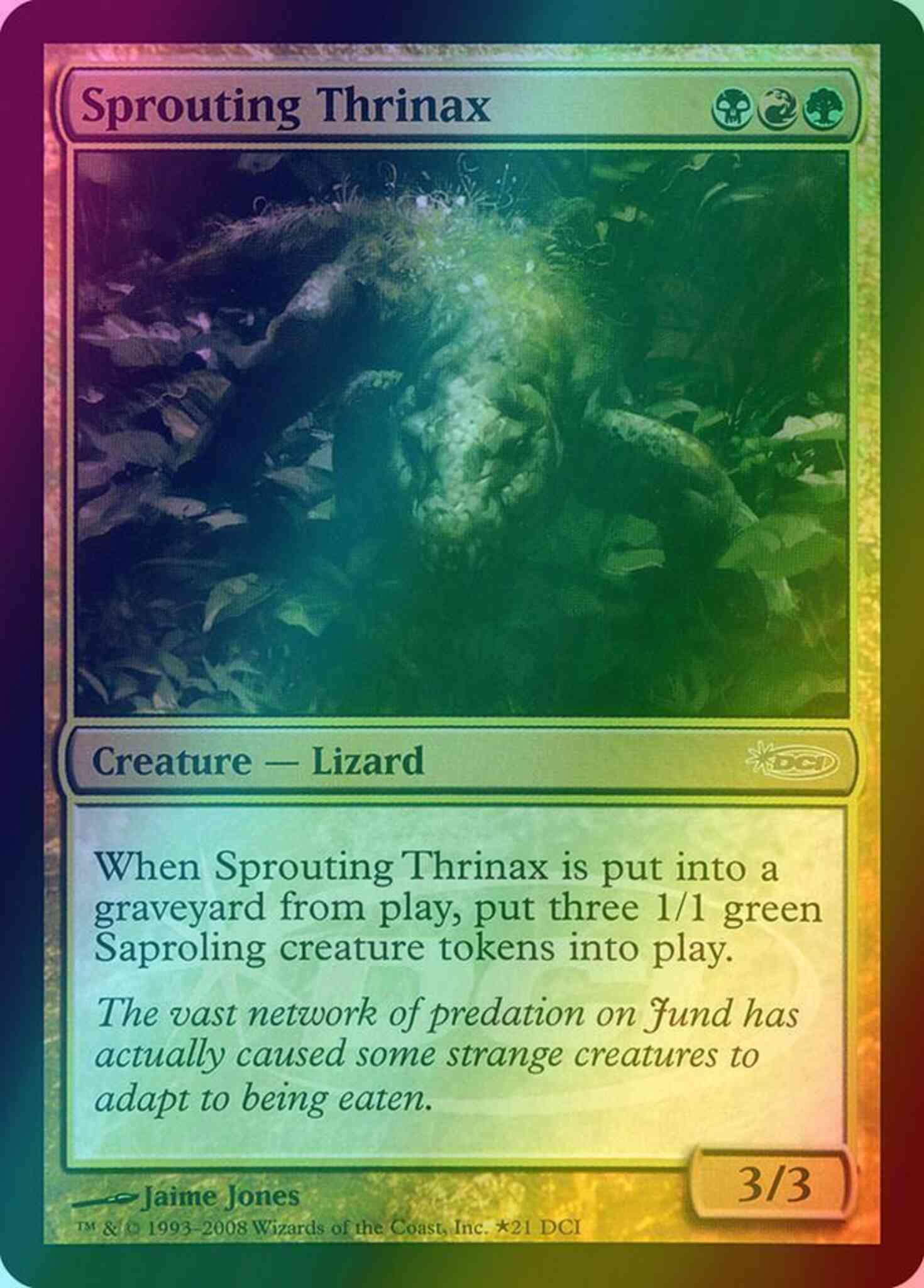 When Sprouting Thrinax dies, create three 1/1 green Saproling creature tokens.