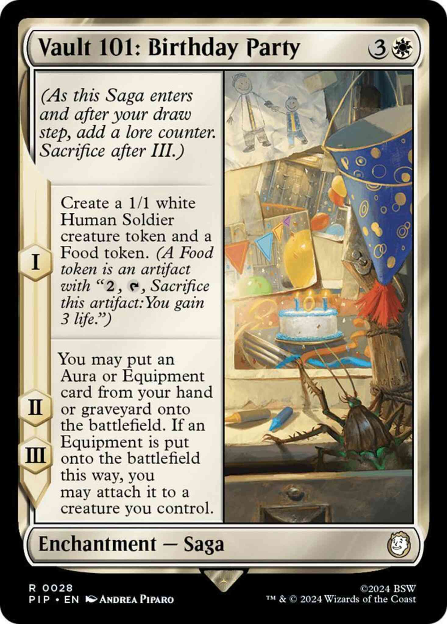Card Text: (As this Saga enters and after your draw step, add a lore counter. Sacrifice after III.) I — Create a 1/1 white Human Soldier creature token and a Food token. (A Food token is an artifact with "{2}, {T}, Sacrifice this artifact: You gain 3 life.") II, III — You may put an Aura or Equipment card from your hand or graveyard onto the battlefield. If an Equipment is put onto the battlefield this way, you may attach it to a creature you control.