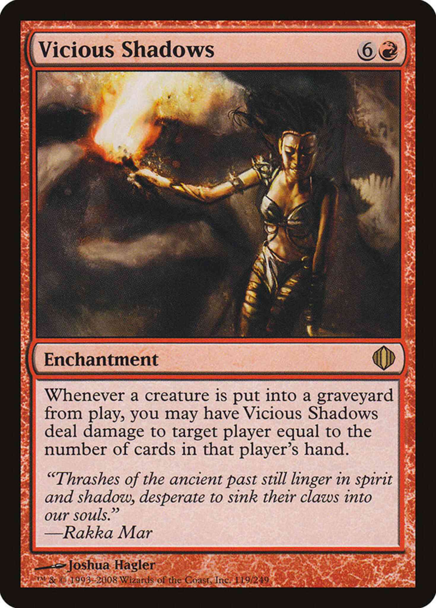 Whenever a creature dies, you may have Vicious Shadows deal damage to target player equal to the number of cards in that player's hand.