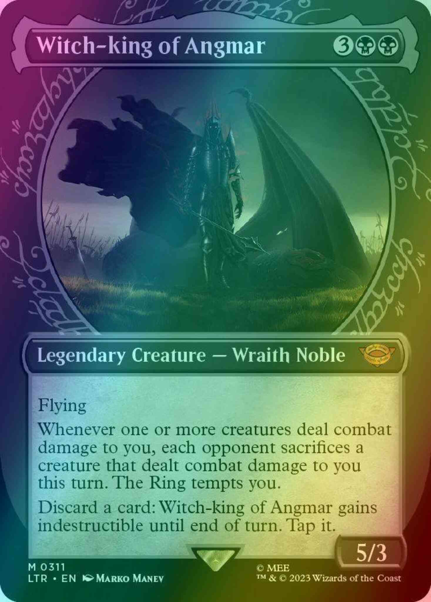 Card Text: Flying Whenever one or more creatures deal combat damage to you, each opponent sacrifices a creature that dealt combat damage to you this turn. The Ring tempts you. Discard a card: Witch-king of Angmar gains indestructible until end of turn. Tap it.