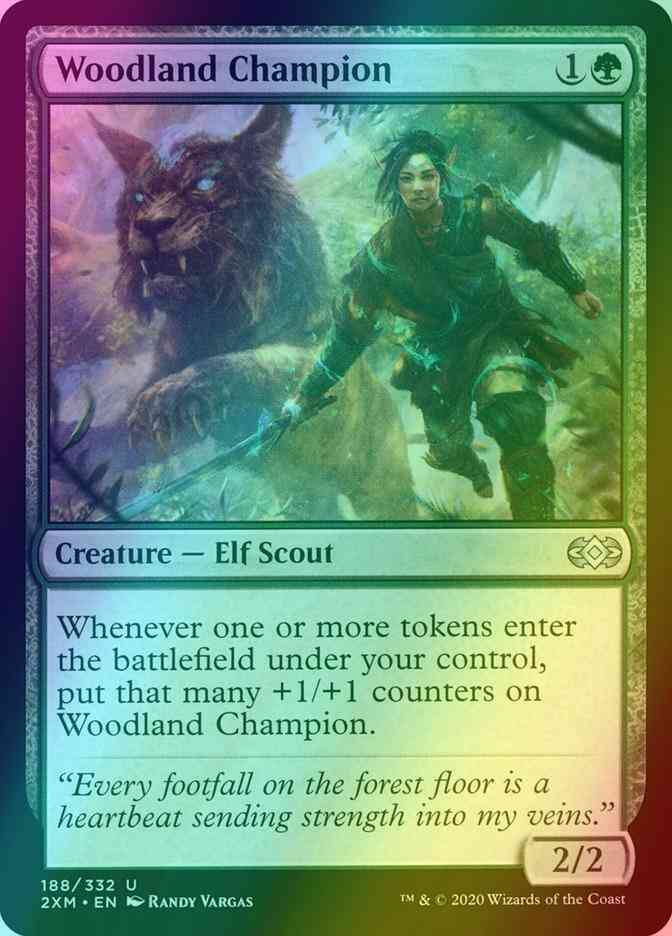 Whenever one or more tokens enter the battlefield under your control, put that many +1/+1 counters on Woodland Champion.