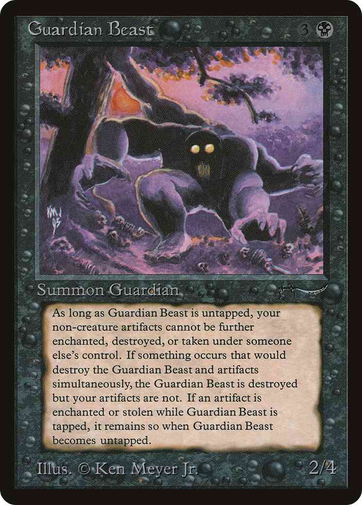 As long as Guardian Beast is untapped, noncreature artifacts you control can't be enchanted, they have indestructible, and other players can't gain control of them. This effect doesn't remove Auras already attached to those artifacts.