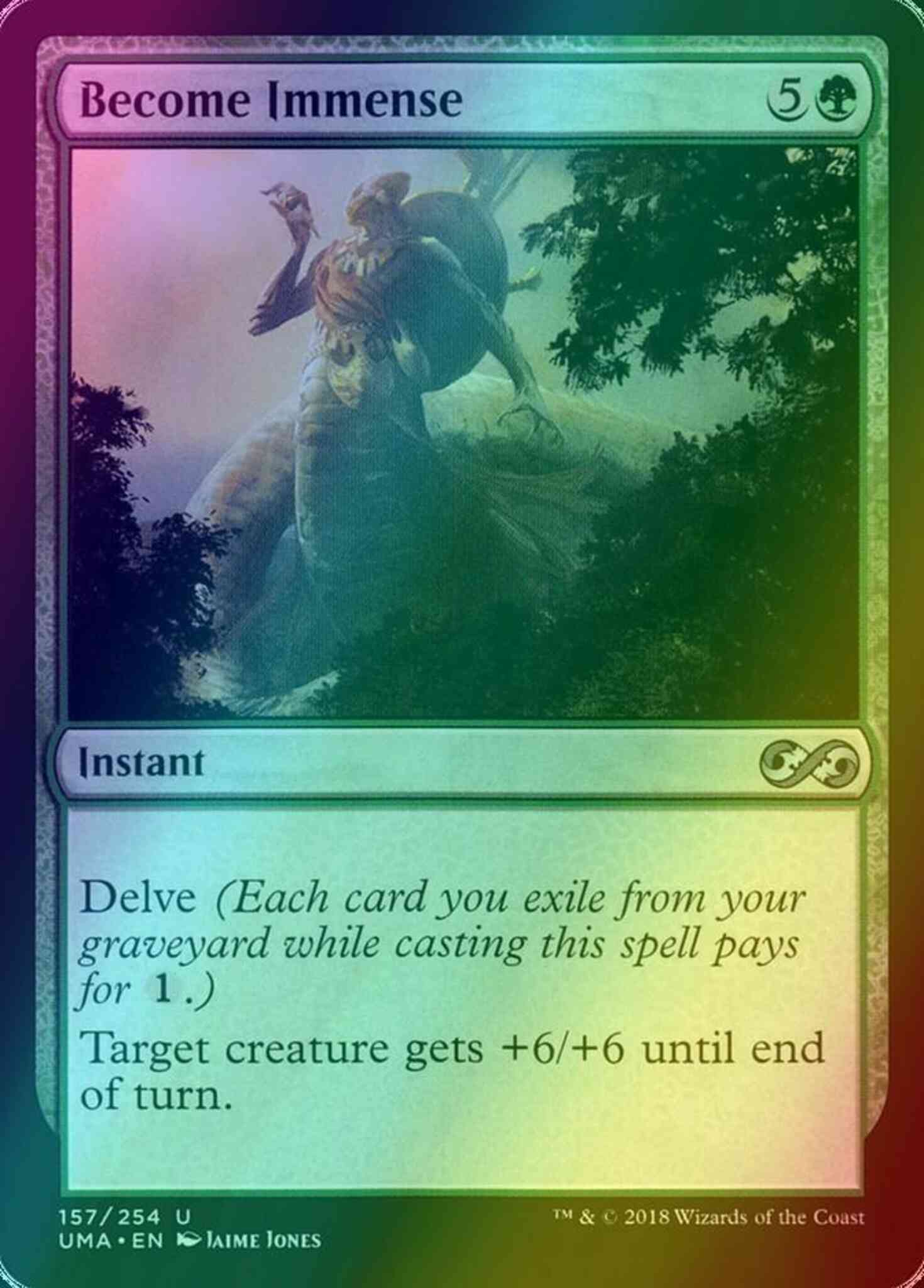 Card Text: Delve (Each card you exile from your graveyard while casting this spell pays for {1}.) Target creature gets +6/+6 until end of turn.