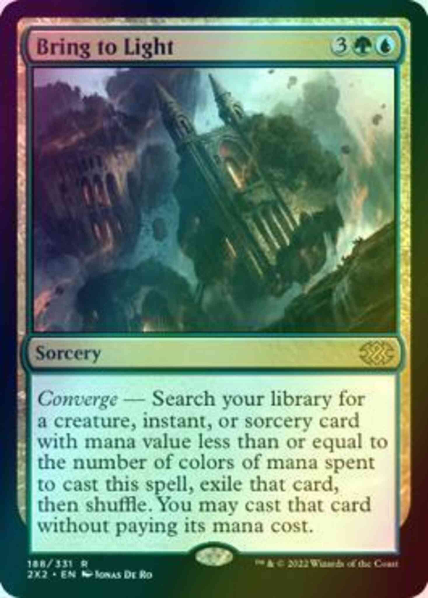 Card Text: Converge — Search your library for a creature, instant, or sorcery card with mana value less than or equal to the number of colors of mana spent to cast this spell, exile that card, then shuffle. You may cast that card without paying its mana cost.