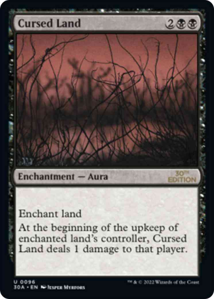 Card Text: Enchant land At the beginning of the upkeep of enchanted land's controller, Cursed Land deals 1 damage to that player.