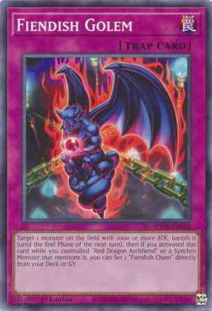 Target 1 monster on the field with 2000 or more ATK; banish it (until the End Phase of the next turn), then if you activated this card while you controlled "Red Dragon Archfiend" or a Synchro Monster that mentions it, you can Set 1 "Fiendish Chain" directly from your Deck or GY.