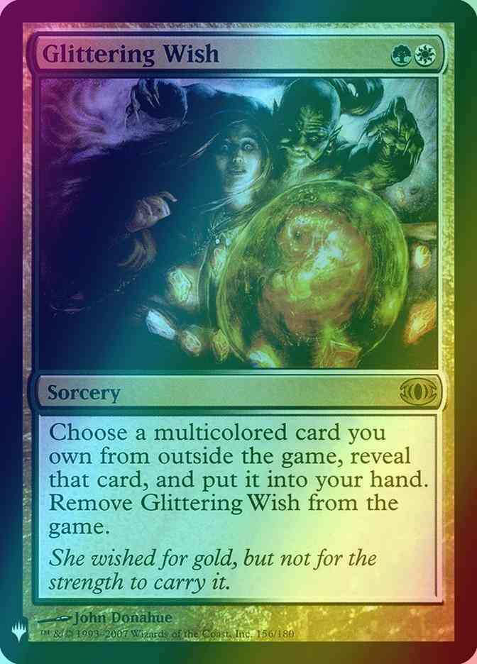You may choose a multicolored card you own from outside the game, reveal that card, and put it into your hand. Exile Glittering Wish.
