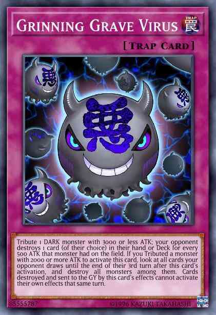 Card Text: Tribute 1 DARK monster with 3000 or less ATK; your opponent destroys 1 card (of their choice) in their hand or Deck for every 500 ATK that monster had on the field. If you Tributed a monster with 2000 or more ATK to activate this card, look at all cards your opponent draws until the end of their 3rd turn after this card's activation, and destroy all monsters among them. Cards destroyed and sent to the GY by this card's effects cannot activate their own effects that same turn.
