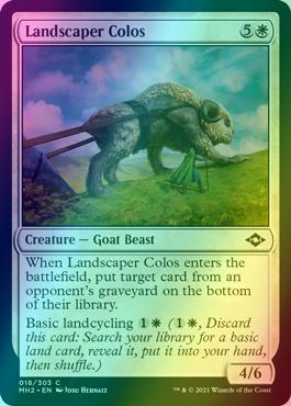 Card Text: When Landscaper Colos enters the battlefield, put target card from an opponent's graveyard on the bottom of their library. Basic landcycling {1}{W} ({1}{W}, Discard this card: Search your library for a basic land card, reveal it, put it into your hand, then shuffle.)