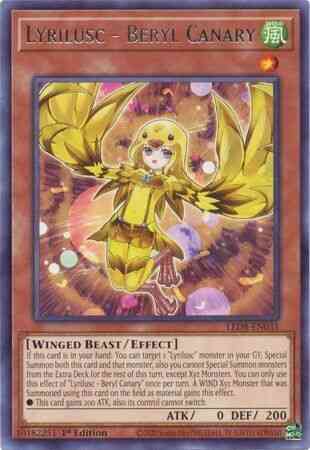 Card Text: If this card is in your hand: You can target 1 "Lyrilusc" monster in your GY; Special Summon both this card and that monster, also you cannot Special Summon monsters from the Extra Deck for the rest of this turn, except Xyz Monsters. You can only use this effect of "Lyrilusc - Beryl Canary" once per turn. A WIND Xyz Monster that was Summoned using this card on the field as material gains this effect. ● This card gains 200 ATK, also its control cannot switch.