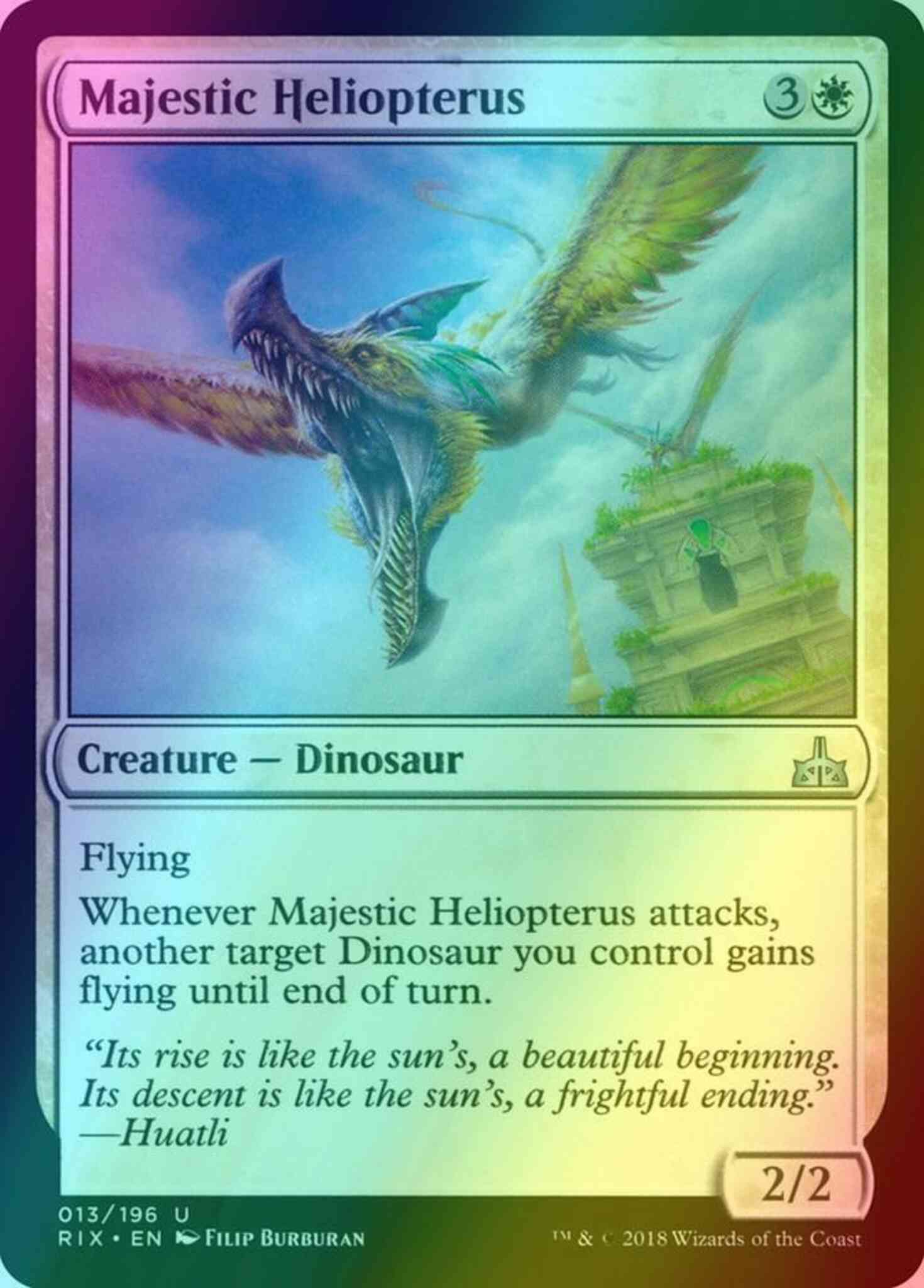 Whenever Majestic Heliopterus attacks, another target Dinosaur you control gains flying until end of turn.
