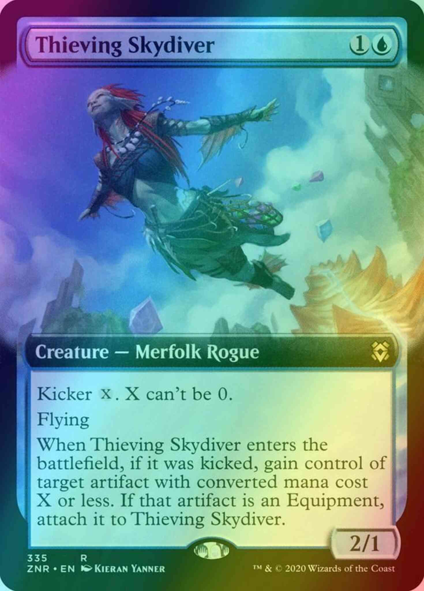 Card Text: Kicker {X}. X can't be 0. (You may pay an additional {X} as you cast this spell.) Flying When Thieving Skydiver enters the battlefield, if it was kicked, gain control of target artifact with converted mana cost X or less. If that artifact is an Equipment, attach it to Thieving Skydiver.