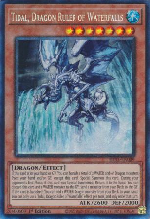 If this card is in your hand or Graveyard: You can banish a total of 2 WATER and/or Dragon-Type monsters from your hand and/or Graveyard, except this card; Special Summon this card. During your opponent's End Phase, if this card was Special Summoned: Return it to the hand. You can discard this card and 1 WATER monster to the Graveyard; send 1 monster from your Deck to the Graveyard. If this card is banished: You can add 1 WATER Dragon-Type monster from your Deck to your hand. You can only use 1 "Tidal, Dragon Ruler of Waterfalls" effect per turn, and only once that turn.