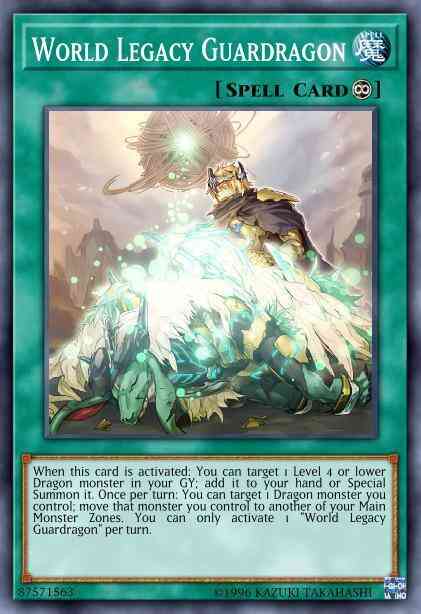 When you activate this card: You can also target 1 Level 4 or lower Dragon monster in your GY; if you did, either add it to your hand or Special Summon it. Once per turn: You can target 1 Dragon monster you control; move that monster you control to another of your Main Monster Zones. You can only activate 1 "World Legacy's Guardragon" per turn.