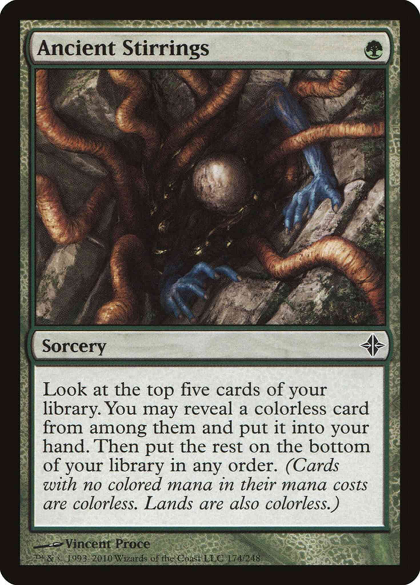 Card Text: Look at the top five cards of your library. You may reveal a colorless card from among them and put it into your hand. Then put the rest on the bottom of your library in any order. (Cards with no colored mana in their mana costs are colorless. Lands are also colorless.)