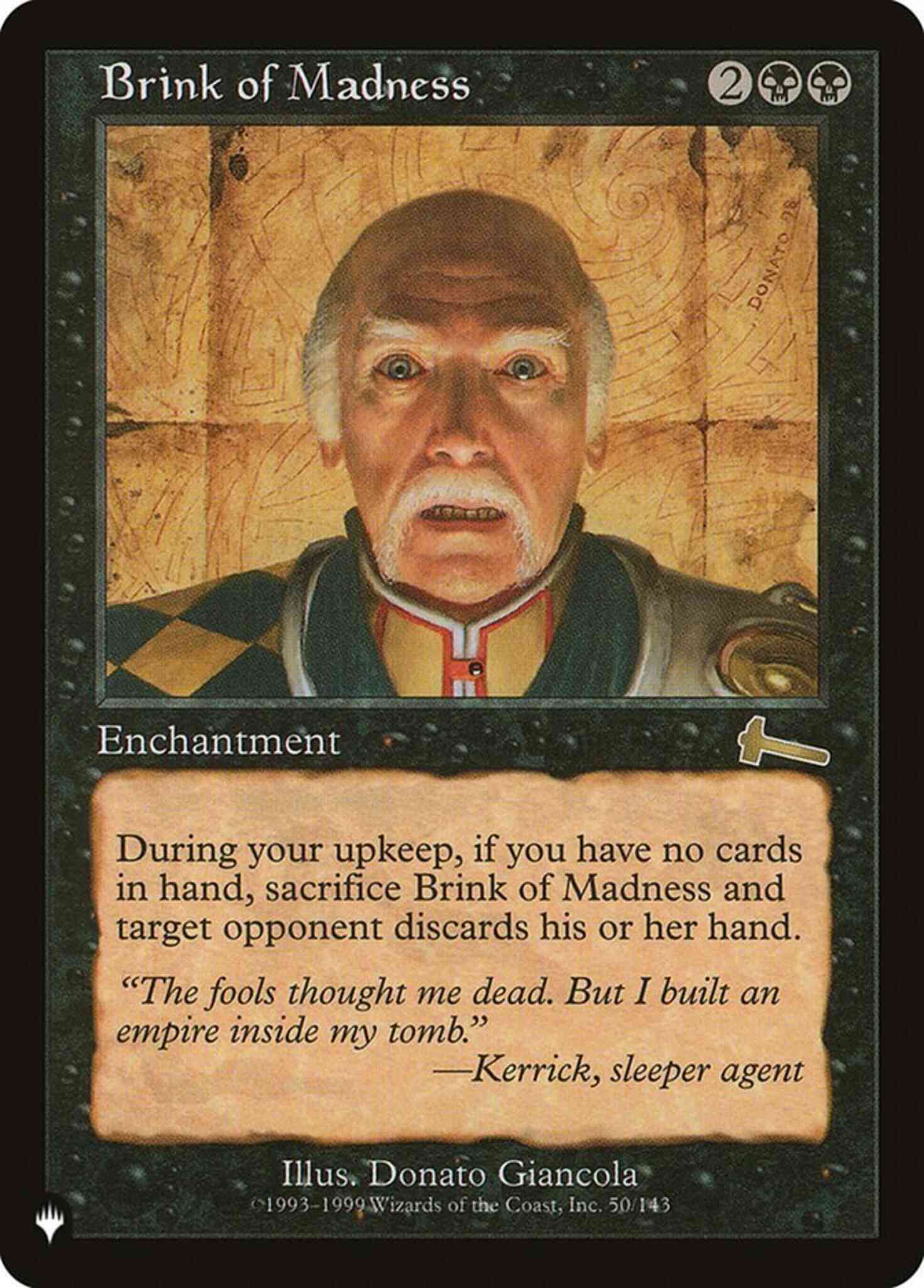 At the beginning of your upkeep, if you have no cards in hand, sacrifice Brink of Madness and target opponent discards their hand.