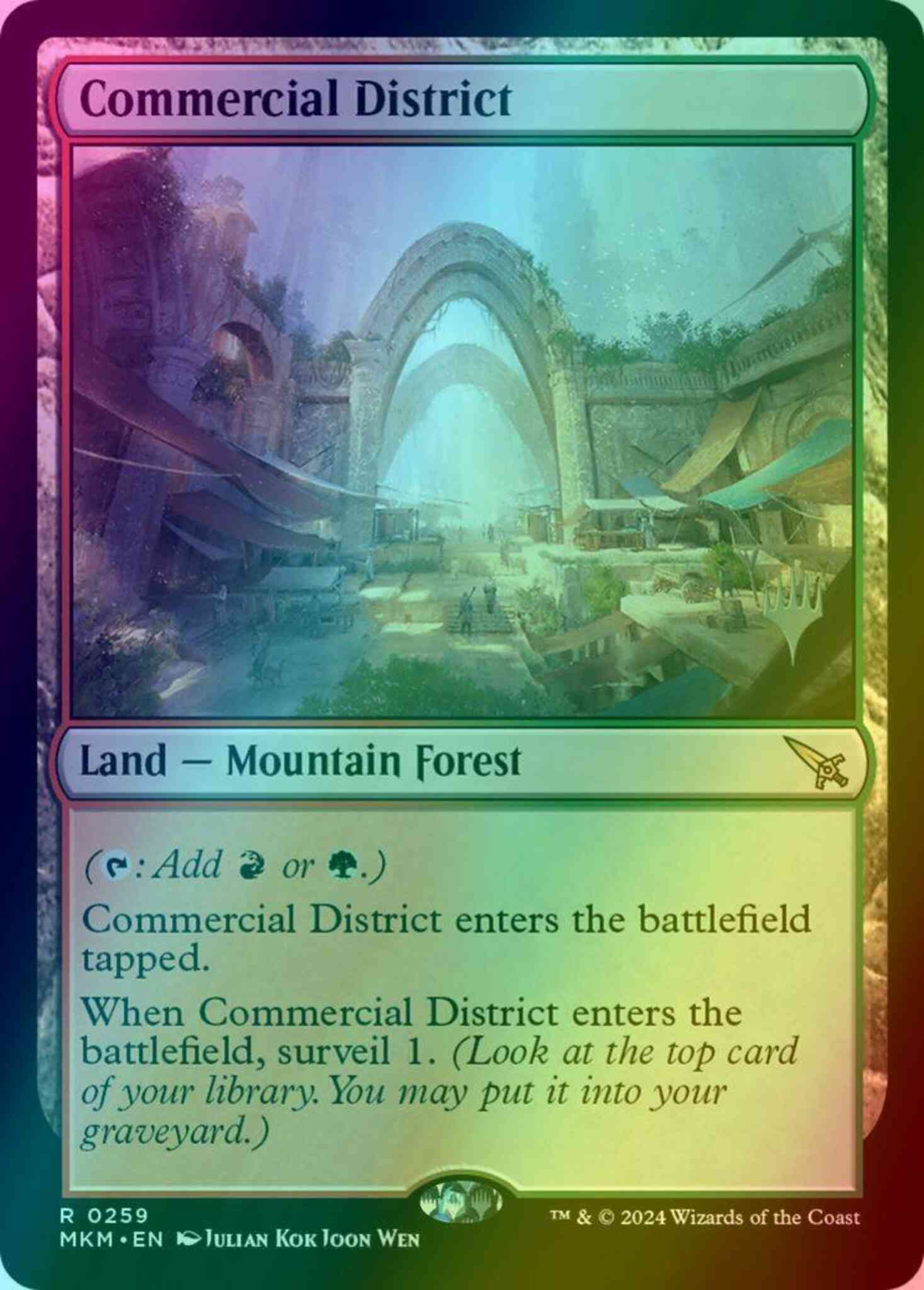 Card Text: ({T}: Add {R} or {G}.) Commercial District enters the battlefield tapped. When Commercial District enters the battlefield, surveil 1. (Look at the top card of your library. You may put it into your graveyard.)