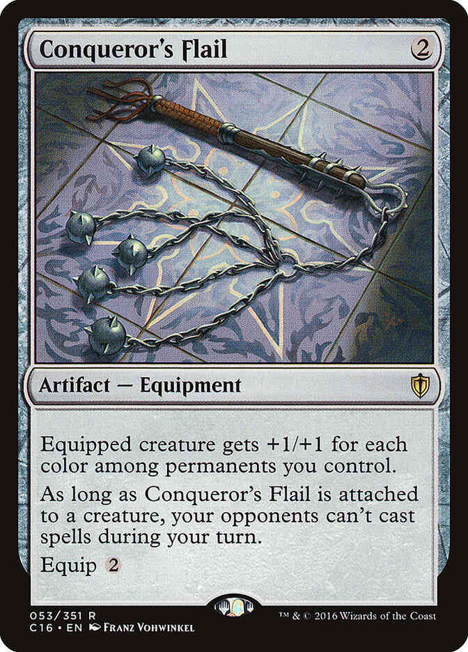 As long as Conqueror's Flail is attached to a creature, your opponents can't cast spells during your turn.