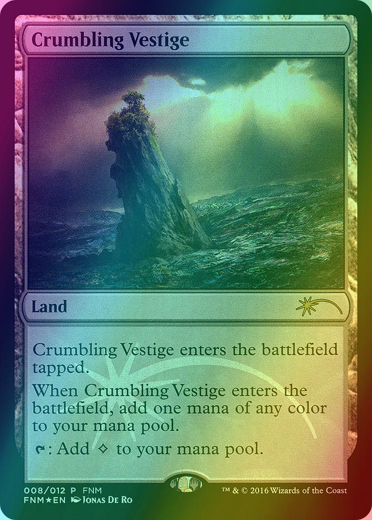 Card Text: Crumbling Vestige enters the battlefield tapped. When Crumbling Vestige enters the battlefield, add one mana of any color. {T}: Add {C}. ({C} represents colorless mana.)