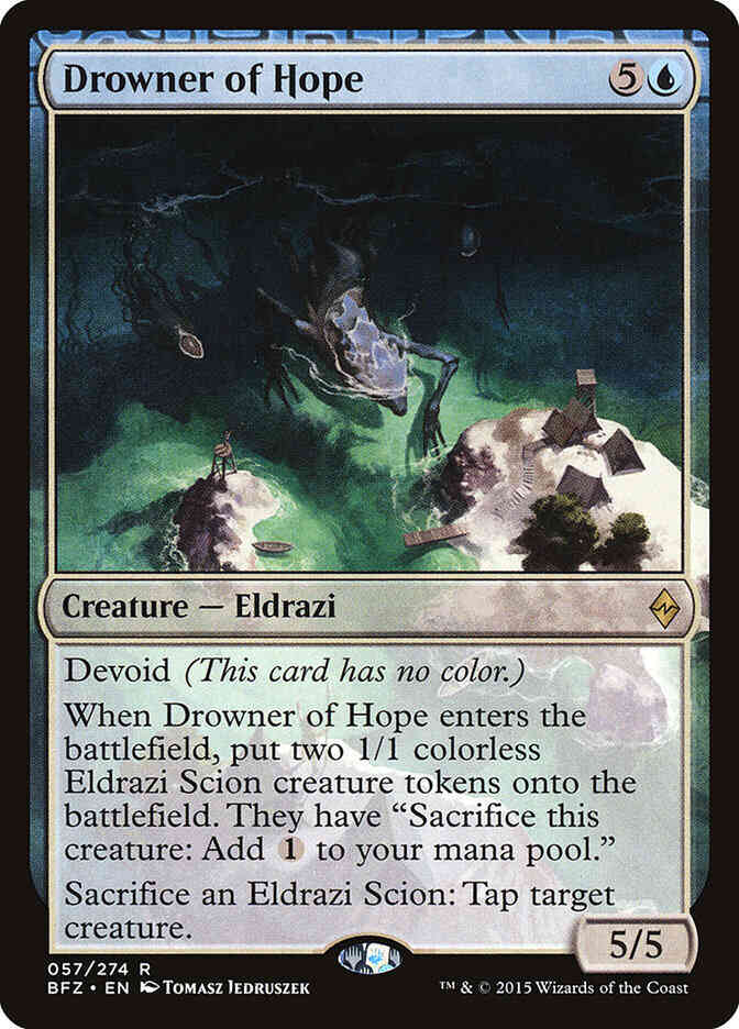 Card Text: Devoid (This card has no color.) When Drowner of Hope enters the battlefield, create two 1/1 colorless Eldrazi Scion creature tokens. They have "Sacrifice this creature: Add {C}." Sacrifice an Eldrazi Scion: Tap target creature.