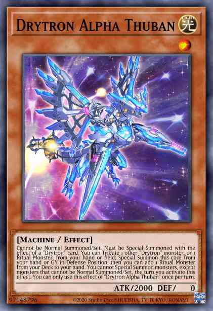 Cannot be Normal Summoned/Set. Must be Special Summoned with the effect of a "Drytron" card. You can Tribute 1 other "Drytron" monster, or 1 Ritual Monster, from your hand or field; Special Summon this card from your hand or GY in Defense Position, then you can add 1 Ritual Monster from your Deck to your hand. You cannot Special Summon monsters, except monsters that cannot be Normal Summoned/Set, the turn you activate this effect. You can only use this effect of "Drytron Alpha Thuban" once per turn.