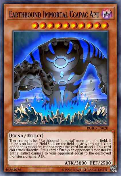 There can only be 1 "Earthbound Immortal" monster on the field. If there is no face-up Field Spell Card on the field, destroy this card. Your opponent cannot target this card for attacks. This card can attack your opponent directly. If this card destroys an opponent's monster by battle: Inflict damage to your opponent equal to the destroyed monster's original ATK.