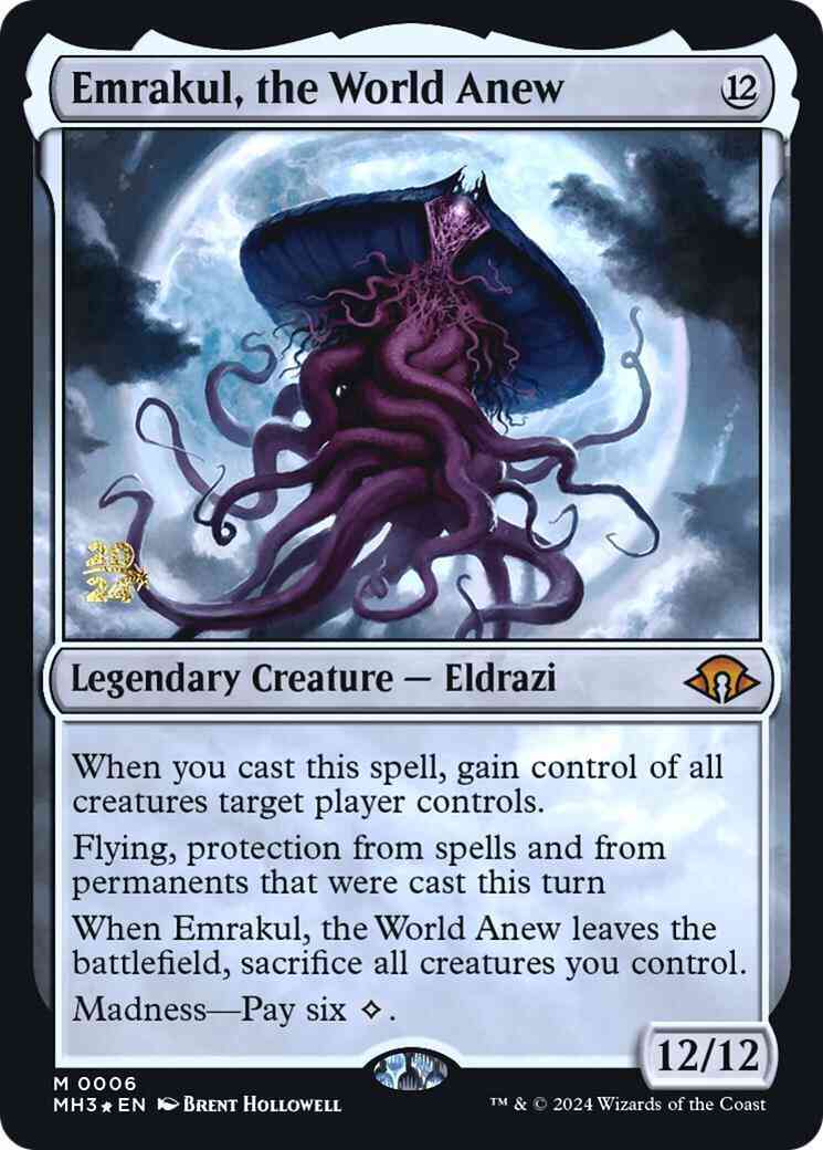 Card Text: When you cast this spell, gain control of all creatures target player controls. Flying, protection from spells and from permanents that were cast this turn When Emrakul, the World Anew leaves the battlefield, sacrifice all creatures you control. Madness—Pay six {C}.