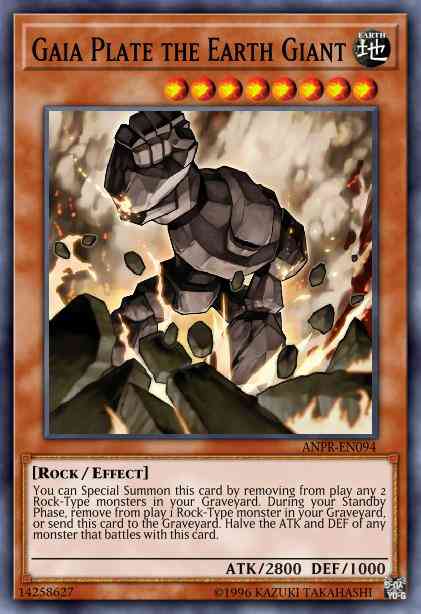 Card Text: You can Special Summon this card by removing from play any 2 Rock-Type monsters in your Graveyard. During your Standby Phase, remove from play 1 Rock-Type monster in your Graveyard, or send this card to the Graveyard. Halve the ATK and DEF of any monster that battles with this card.