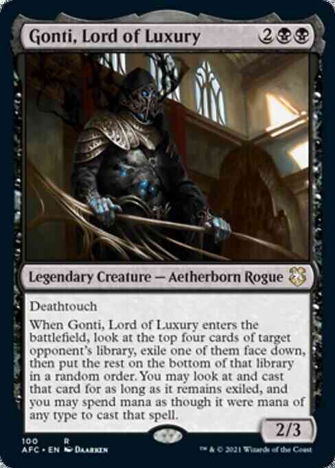 When Gonti, Lord of Luxury enters the battlefield, look at the top four cards of target opponent's library, exile one of them face down, then put the rest on the bottom of that library in a random order. You may look at and cast that card for as long as it remains exiled, and you may spend mana as though it were mana of any type to cast that spell.