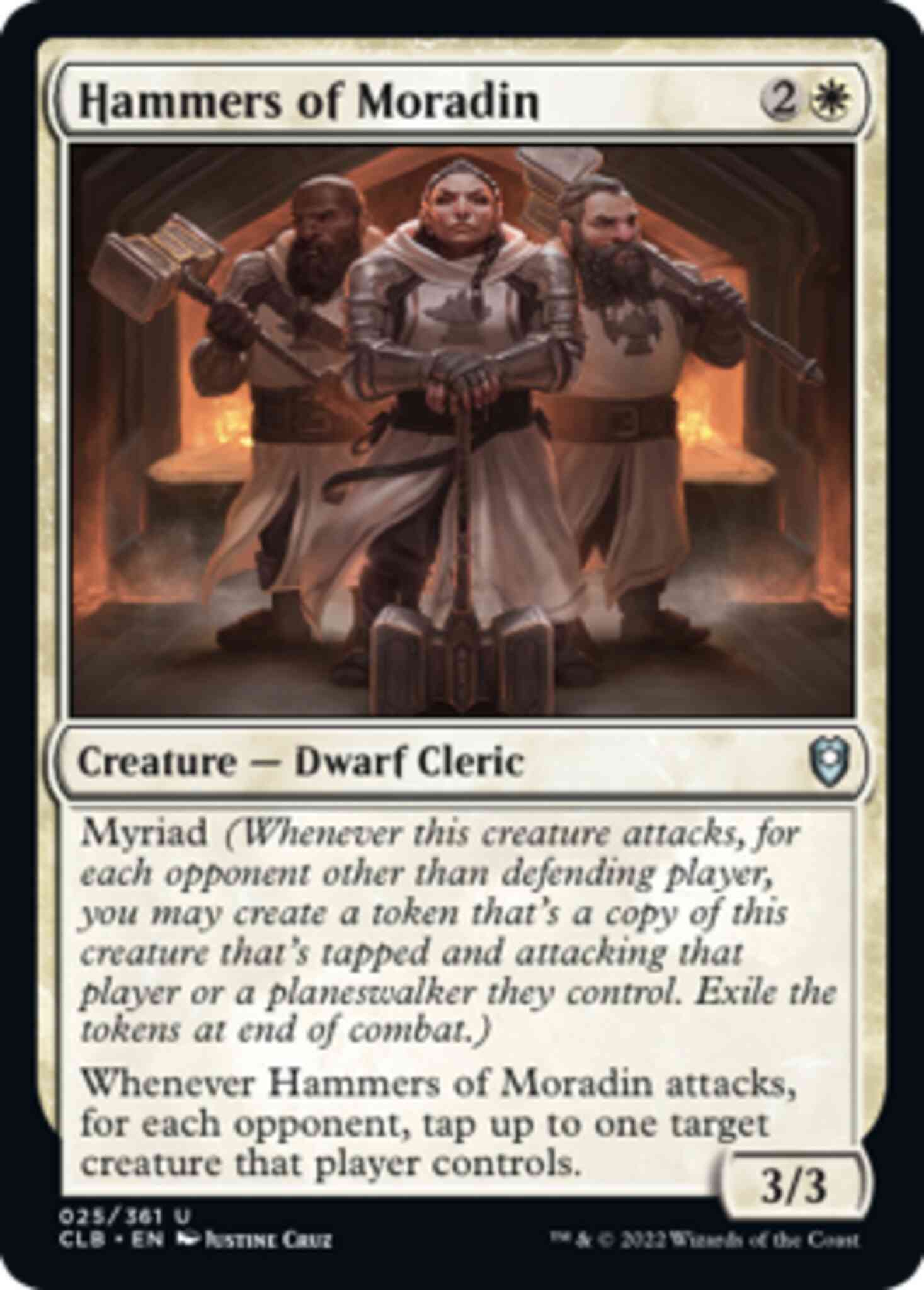 Card Text: Myriad (Whenever this creature attacks, for each opponent other than defending player, you may create a token that's a copy of this creature that's tapped and attacking that player or a planeswalker they control. Exile the tokens at end of combat.) Whenever Hammers of Moradin attacks, for each opponent, tap up to one target creature that player controls.